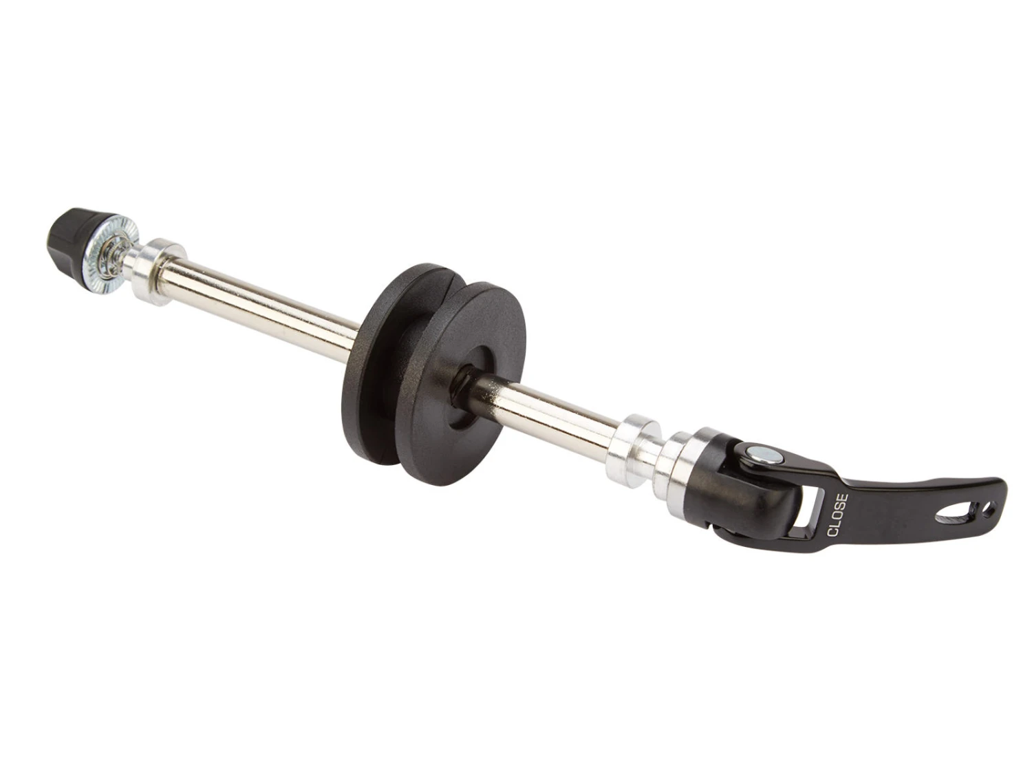 När du har tagit av bakhjulet sätts kedjehållarens bult fyrkantiga del upp i gaffeln och spänns fast med snabbspänningen. Kedjan läggs i spåret på plastdelen och du är redo att köra runt kedjan eller packa ner cykeln.