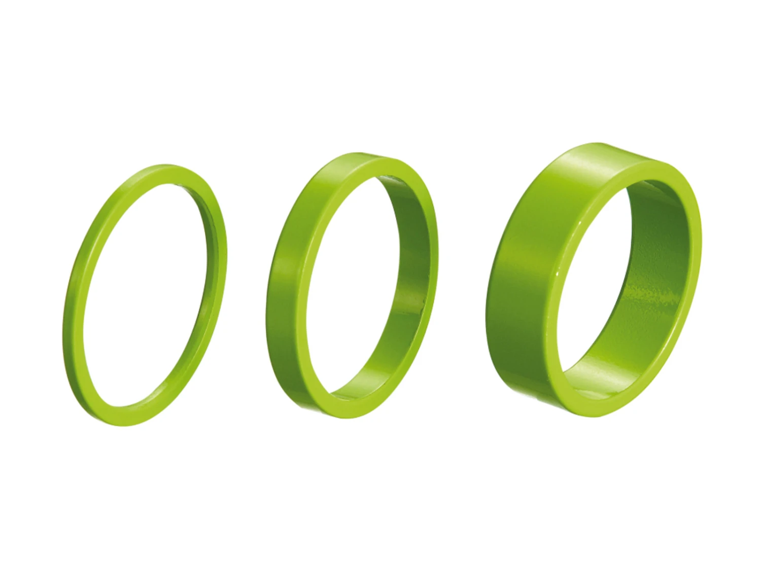 Tre gröna aluminiumavstånd för din cykels framgaffel (1 1/8 ”). Avstånden mäter 2/5/10 mm