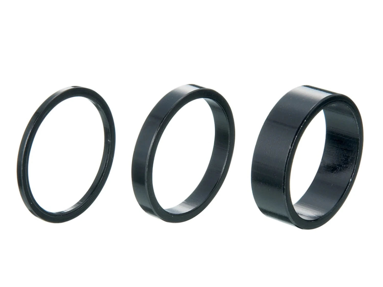 Här får du tre aluminiumavstånd i svart. De passar en 1 1/8 ”gaffelstång och mäter 2, 5 respektive 10 mm.