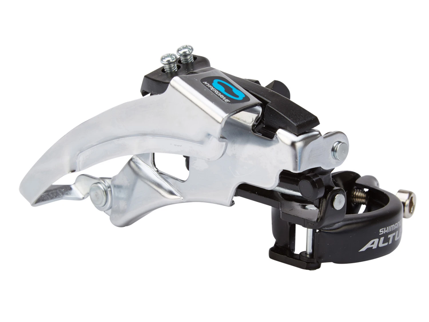 Shimano Altus framväxel FD-M310-X6 till montering med spännband runt cykelns sadelrör. Spännband passar till sadelrörs diameter på 31,8 eller 34,9mm. Växelfunktionen är av typen Top Swing, som betyder att växelbytesrörelsen sitter högre än själva monteringsbeslaget. Framväxeln har Dual Pull kabeldrag, det vill säga att kabeln kan monteras oavsett om kabelledningen på cykeln kommer uppifrån eller nedifrån.