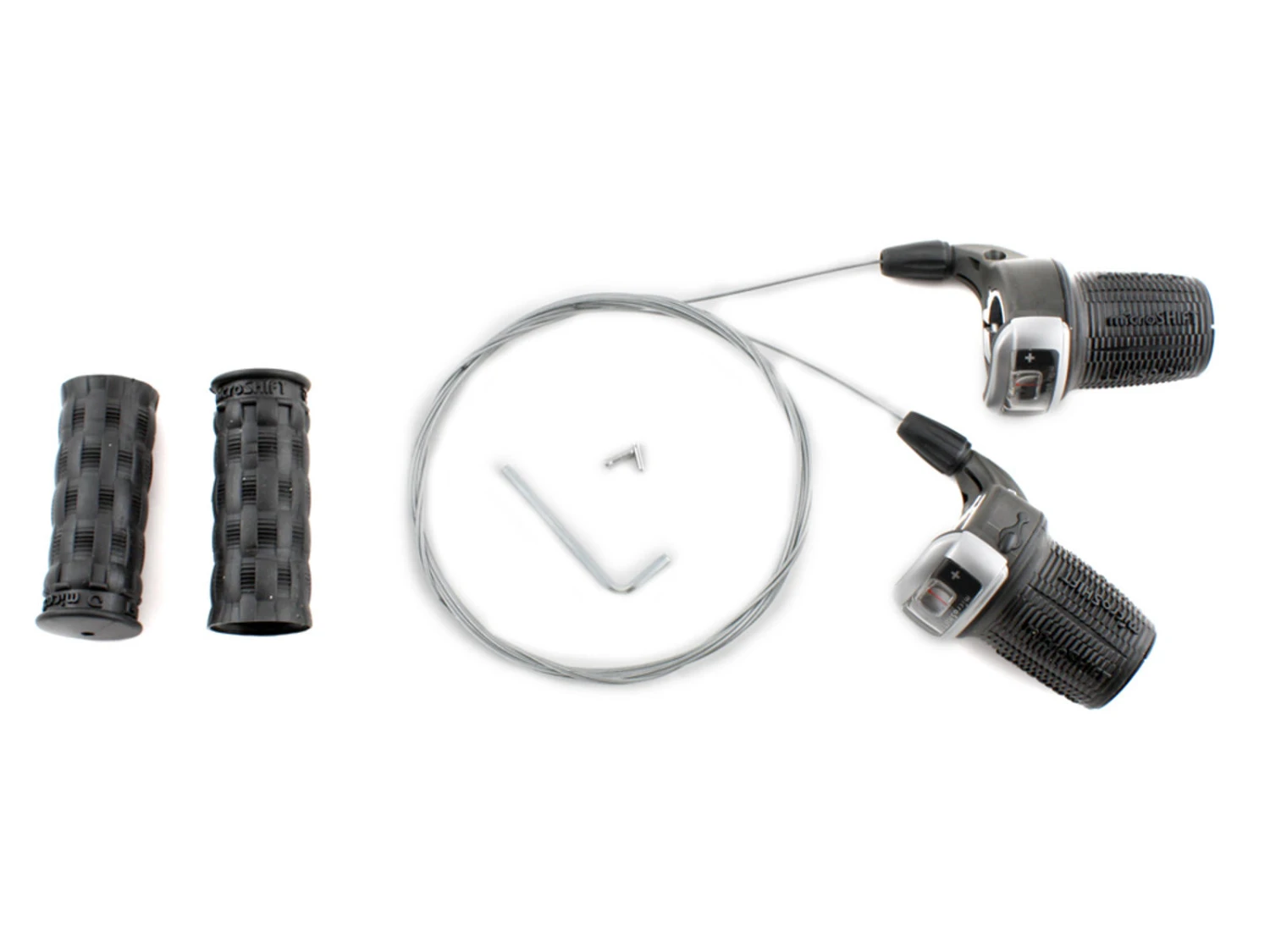 Microshift vridhandtags-set till 3×8 växlars-system, med index på växelbytet, så den byter en växel för varje klock på kassetten på bakhjulet. Det medföljer rostfria växelvajrar till bägge grepp.