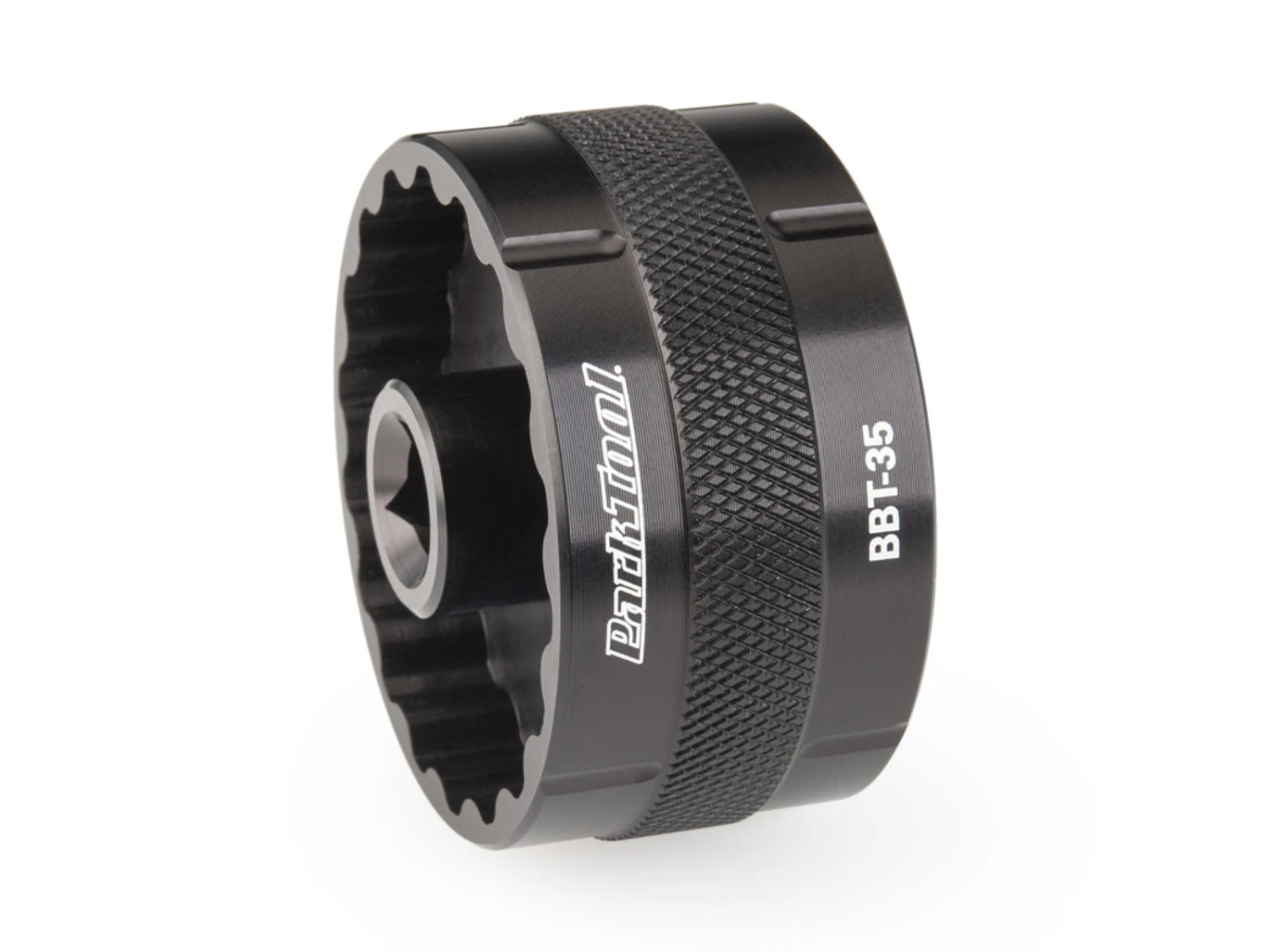 Denna CNC-frittdragare från Park Tool är ett dubbelsidig aluminiumverktyg för att demontera 12- och 36-exteriör vevhusskålar. Trigaren passar på den övre skiftnyckeln med 3/8 ”-drivning.