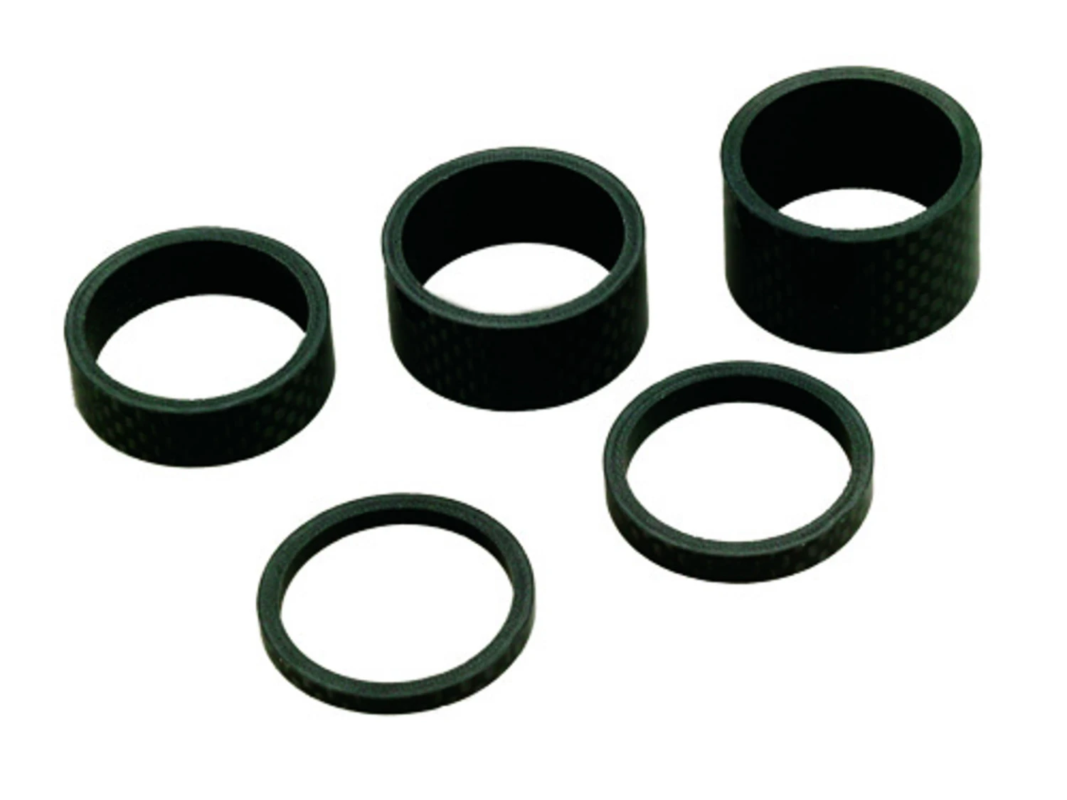 Uppsättning av distanser i fem olika storlekar. 1 av vardera: 3,5,10,15 och 20 mm. För gaffelstjälkar 1-1 / 8 ”. De svarta distanserna är gjorda av kol. Detta gör det till ett idealiskt verktyg för din gaffel så att en hög funktionalitetsnivå kan upprätthållas.