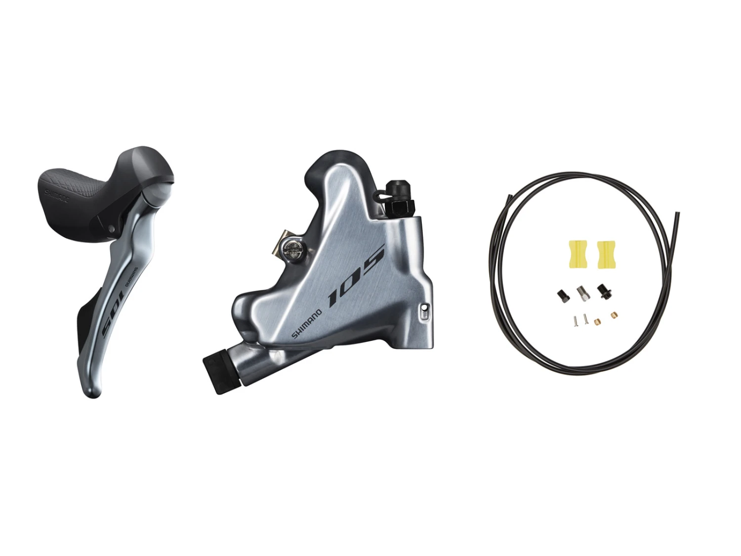 Detta läckra bromssats är en del av Shimano 105-serien. Satsen inkluderar ett växelgrepp, hydrauliskt bromsgrepp, en oljeslang och en hydraulisk bromsok. Du kan använda greppet om din tävlingscykel har 11-växlad kassett och tävlingsstyr, där greppet är monterat på höger sida.