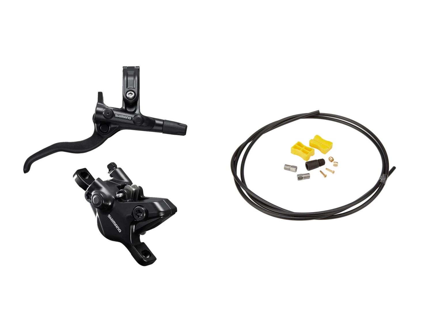 Här får du en komplett Shimano MT4101 hydraulbromsuppsättning på baksidan. Satsen består av en bromsspak, en kaliber och en bromsslang och kommer förmonterad / monterad – precis som det är oljefyllt. Observera att satsen inte innehåller bromsokadapter – dessa måste köpas separat vid behov. Bromssatsen är designad för mountainbikes, stadscyklar och vandringscyklar.