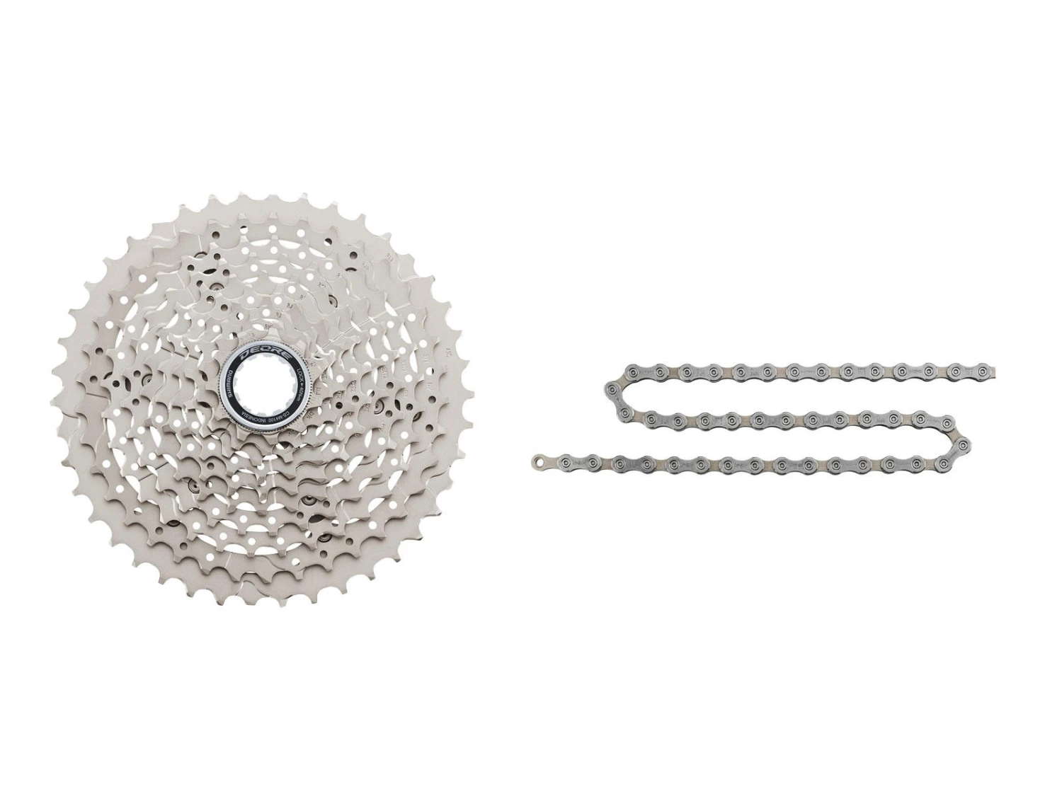 När du byter kassett måste du även byta kedja och du får båda delarna i detta paket. Setet består av Shimano Deore 10 växelkassett med växelområde 11-42 kuggar och Shimano HG54 kedja som passar där och inkluderar även en kopplingsstift för kedjan.