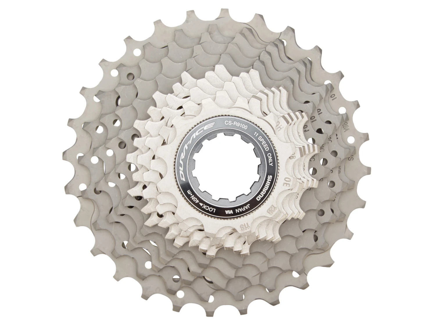 Shimano Dura Ace CS-R9100 kassettens tandkombination går från 12 till 28 tänder. Det är en kassett, som med sin kombination av styrka och låg vikt, är perfekt till landsvägscykling på högsta nivå. Shimano HG-EV 11 växlars kedjan är att rekommendera till denna kassett.