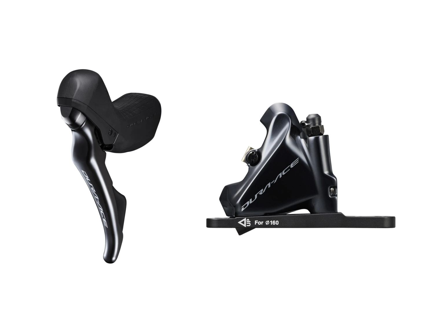 Detta Shimano Dura Ace-bromssats består av växel- och bromsgrepp, hydraulisk bromsok och oljeslang. Växelspaken är avsedd för mekanisk växellåda och för växling på dubbel vevställ. Används uteslutande på tävlingshjul och på tävlingscyklar designade för skivbromsar.
