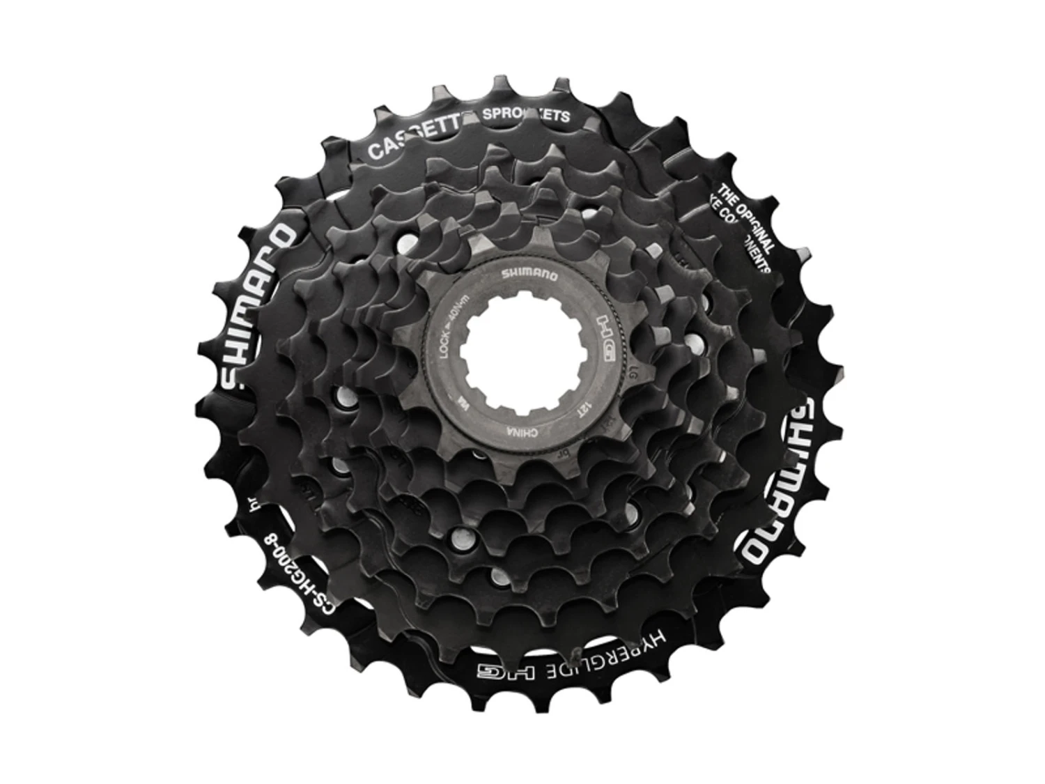 Denna Shimano Tourney 8 växlars kassett har en tand-kombination som går från 12 upp till 32 tänder.