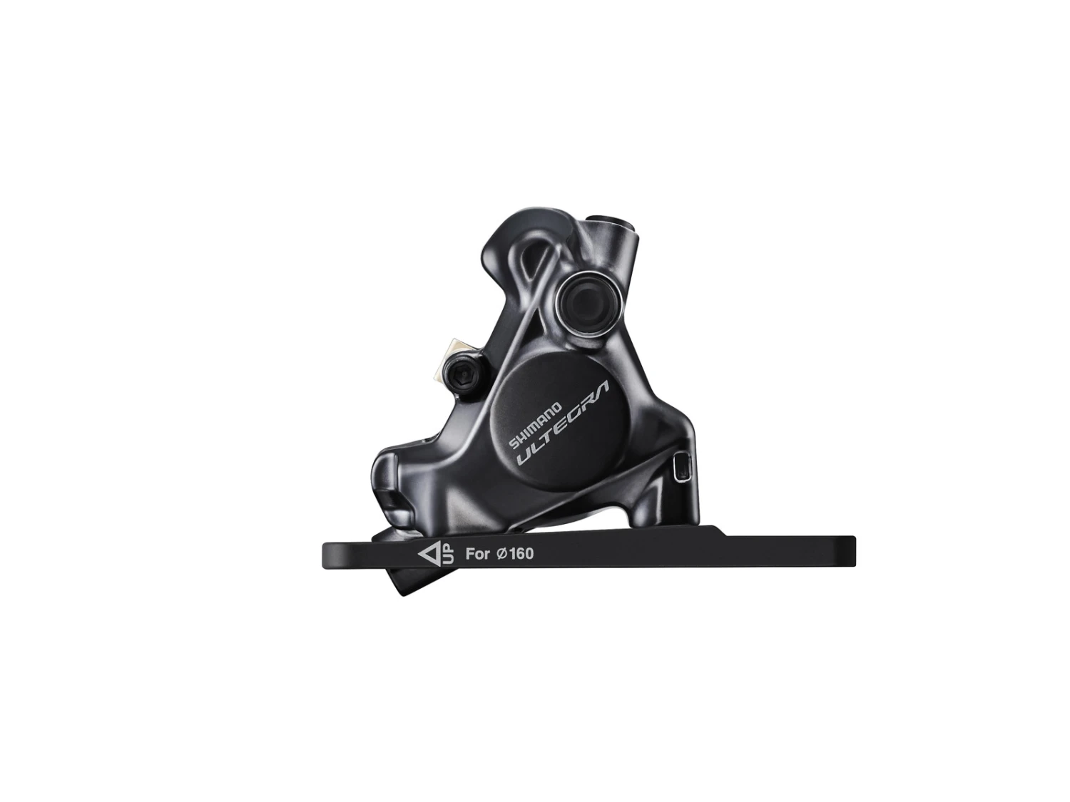 Denna Shimano Ultegra hydrauliska bromsok tillhör komponenterna i Shimano 12 -växlar och används för landsvägscyklar. Bromsoket är monterat längst ner på cykelns framgaffel.