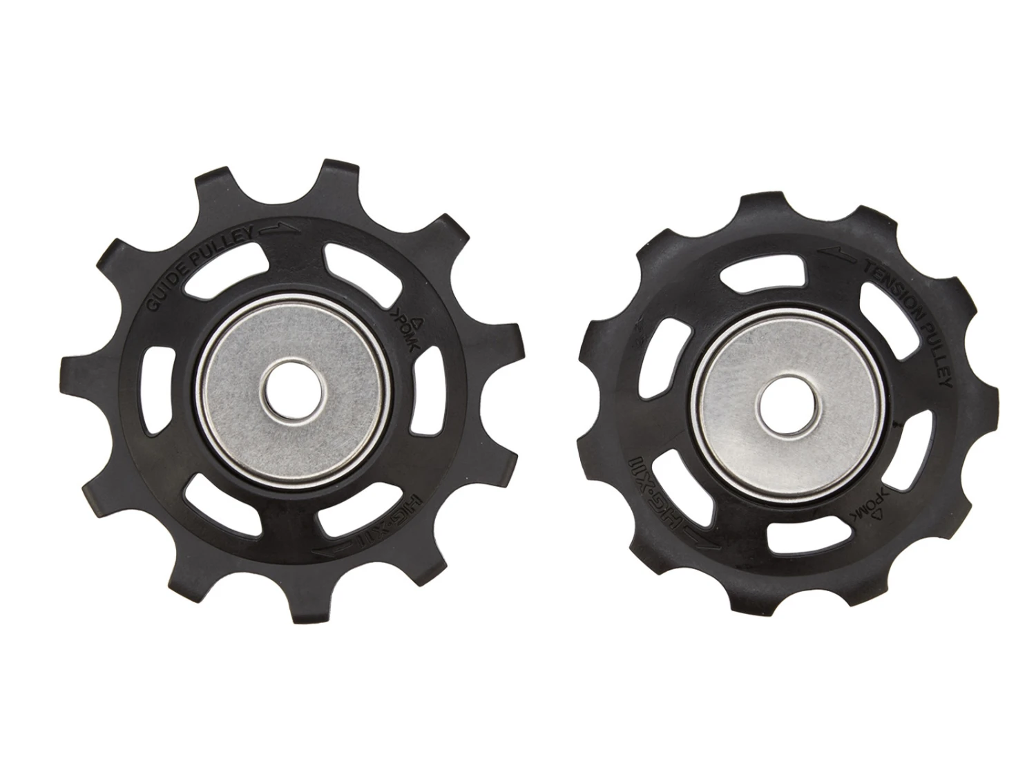 Detta set med Shimano rulltrissor består av en övre och en nedre rulltrissa, som är framställda i nylon. Kedjeledarhjulet har 11 tänder och passar till Shimanos XTR bakväxel. Shimano har framställt dessa rulltrissor med stängda kullager och dammskydd. Rulltrissorna är produceradae i nylon och med stålbussning. Rulltrissorna består av av ett bulthål och levereras exklusive bultar.